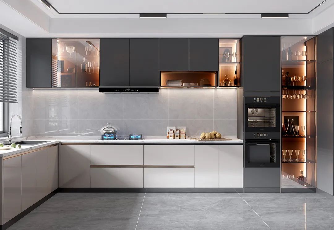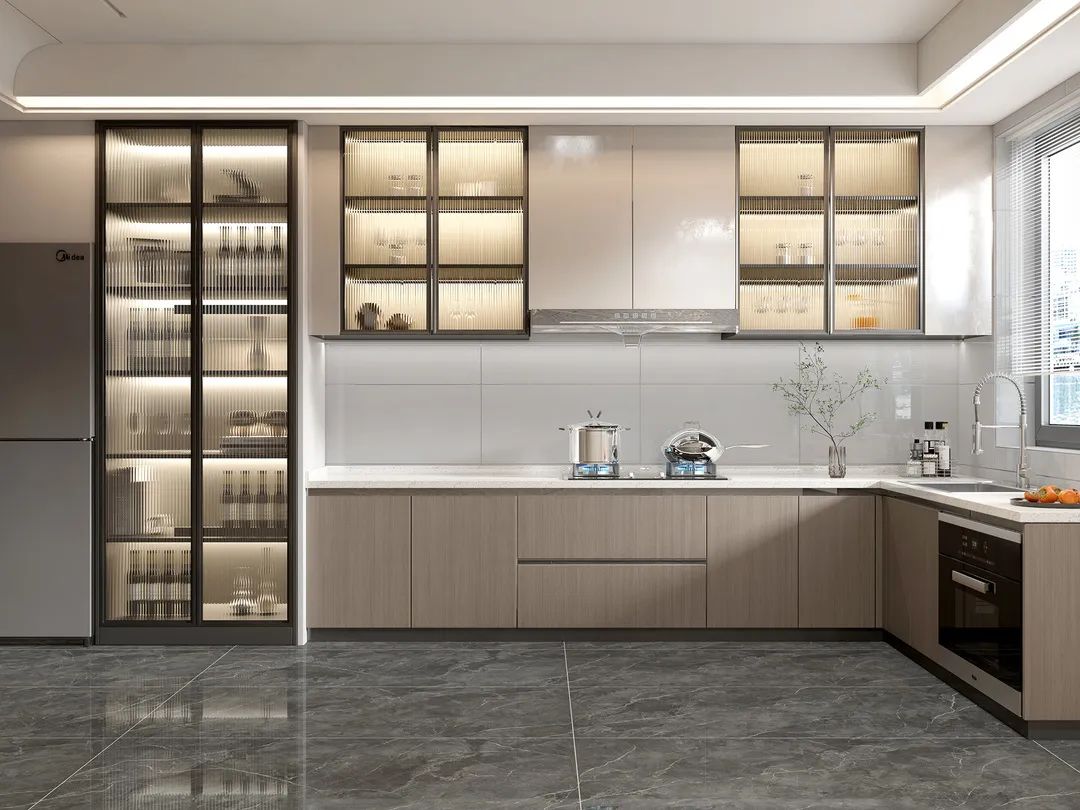 L型厨房设计能充分利用拐角空间,把洗菜区与烹饪区分开,多人操作也能减少碰撞。上橱柜与下地柜衔接的地方,加入流动性强的石材元素不显呆板,给空间带来动感。