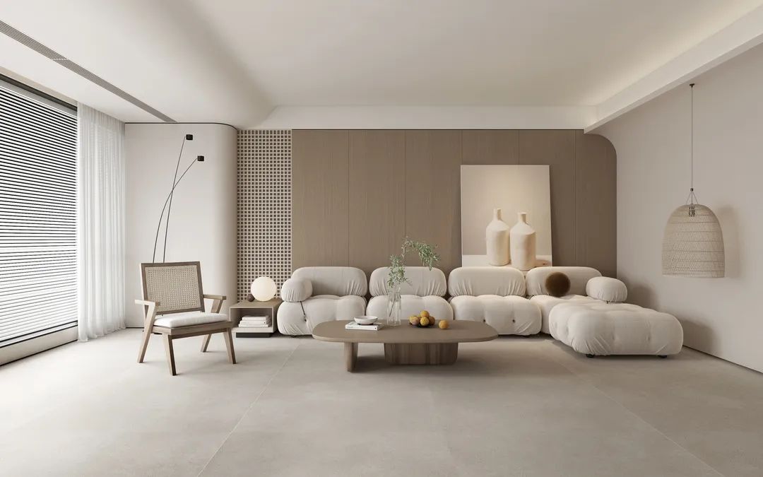 作为侘寂风格主要空间——客厅空间(地NME412AS1908)预判了你所有的活动内容,无论你坐、躺、睡、卧、趴、站、跳,都可。