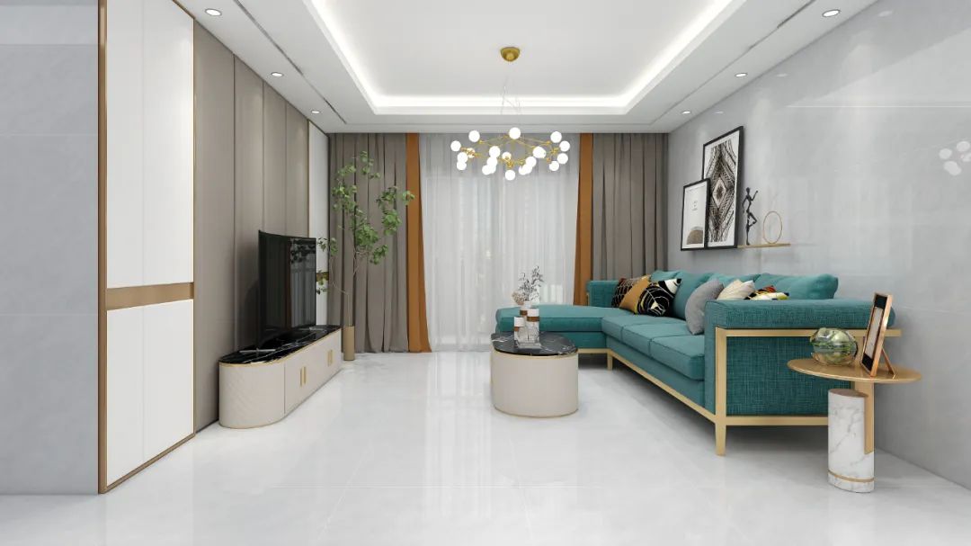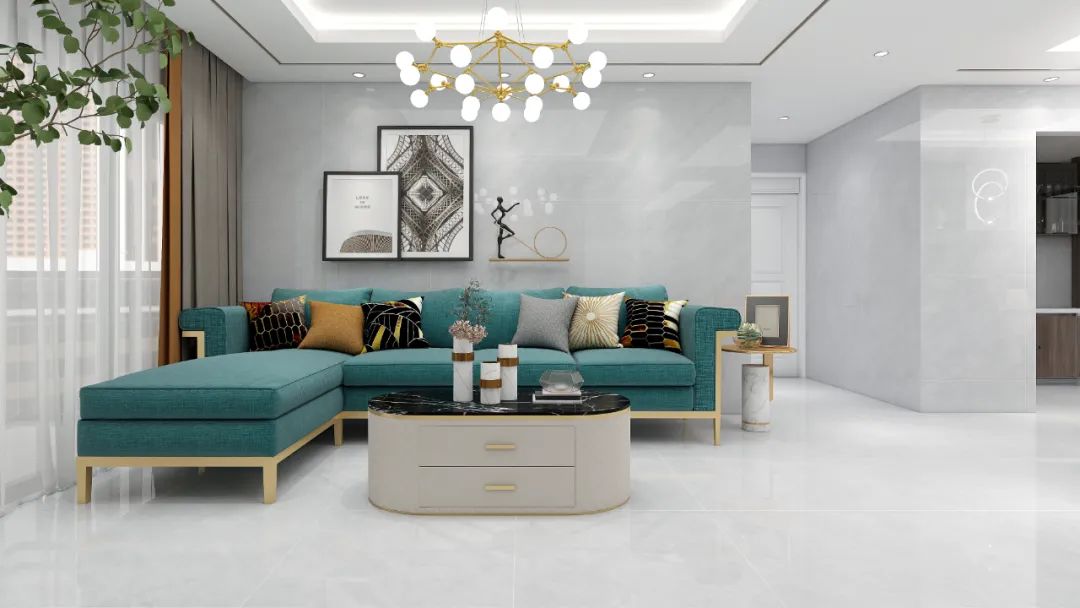 丝顺的拿铁灰作为空间衬托,湖绿复古美式沙发占据视觉中心,让撞色的新鲜感融进舒适感,畅想未来温馨生活。
