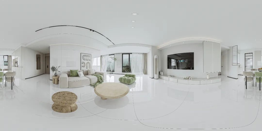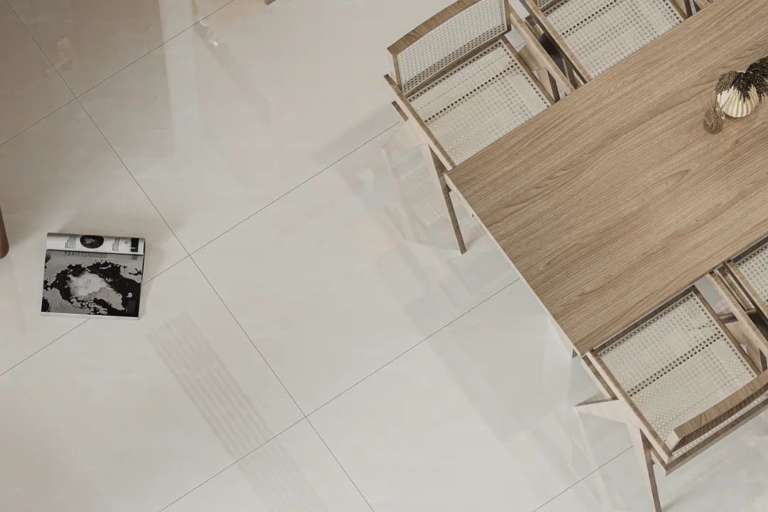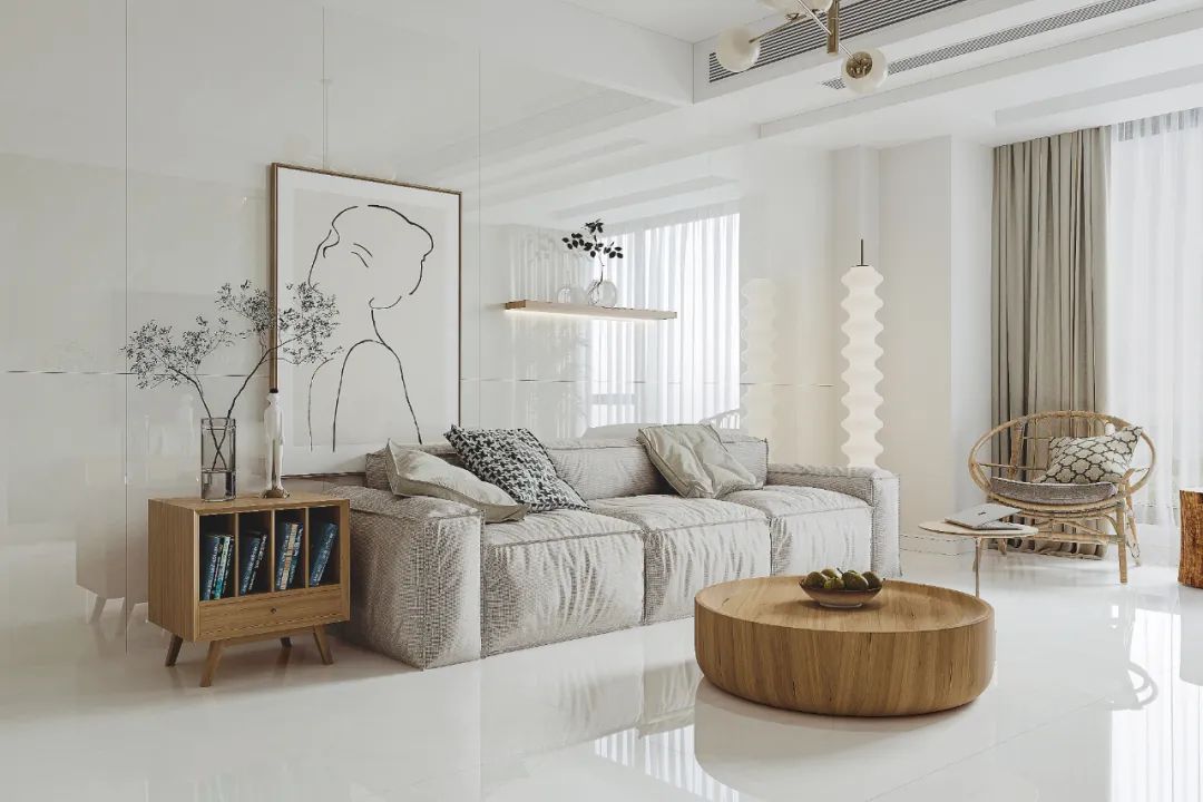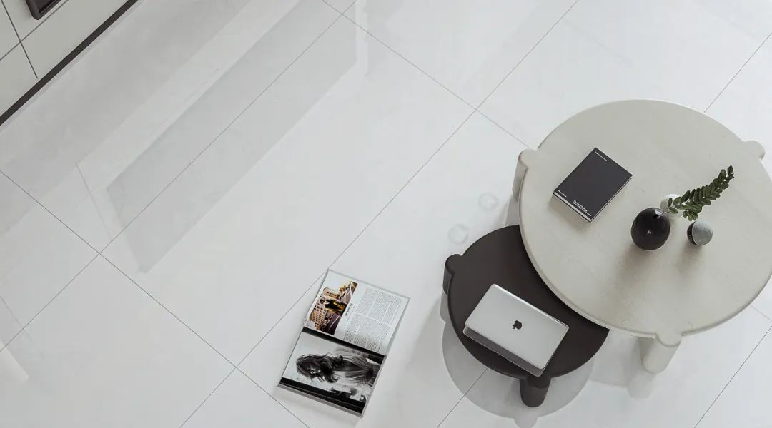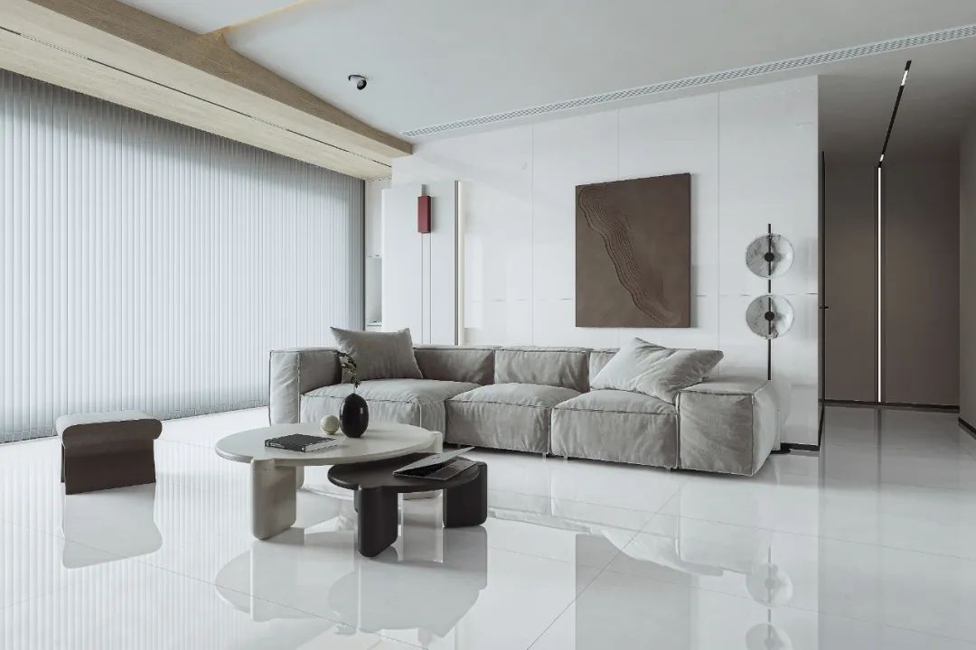 浅色系增加空间轻盈通透,反光亮面玉石瓷砖调节昏暗的室内光线,达到整体空间和谐。