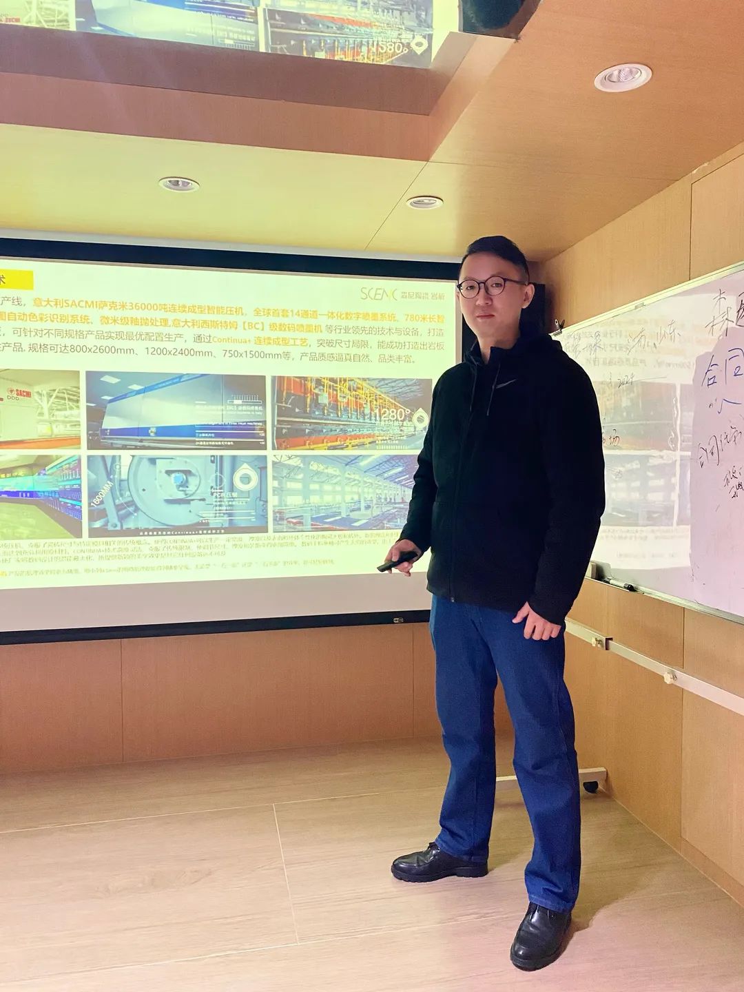 森尼陶瓷·岩板产品经理陈斌从区位优势、佛山本“土”优势、产品优势及匠心文化等各方面展开。