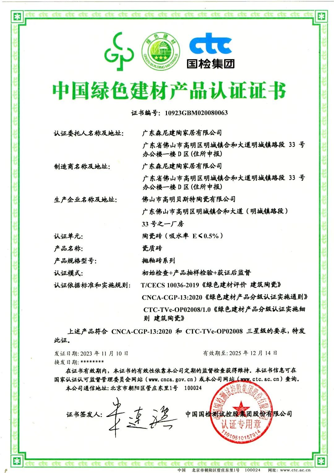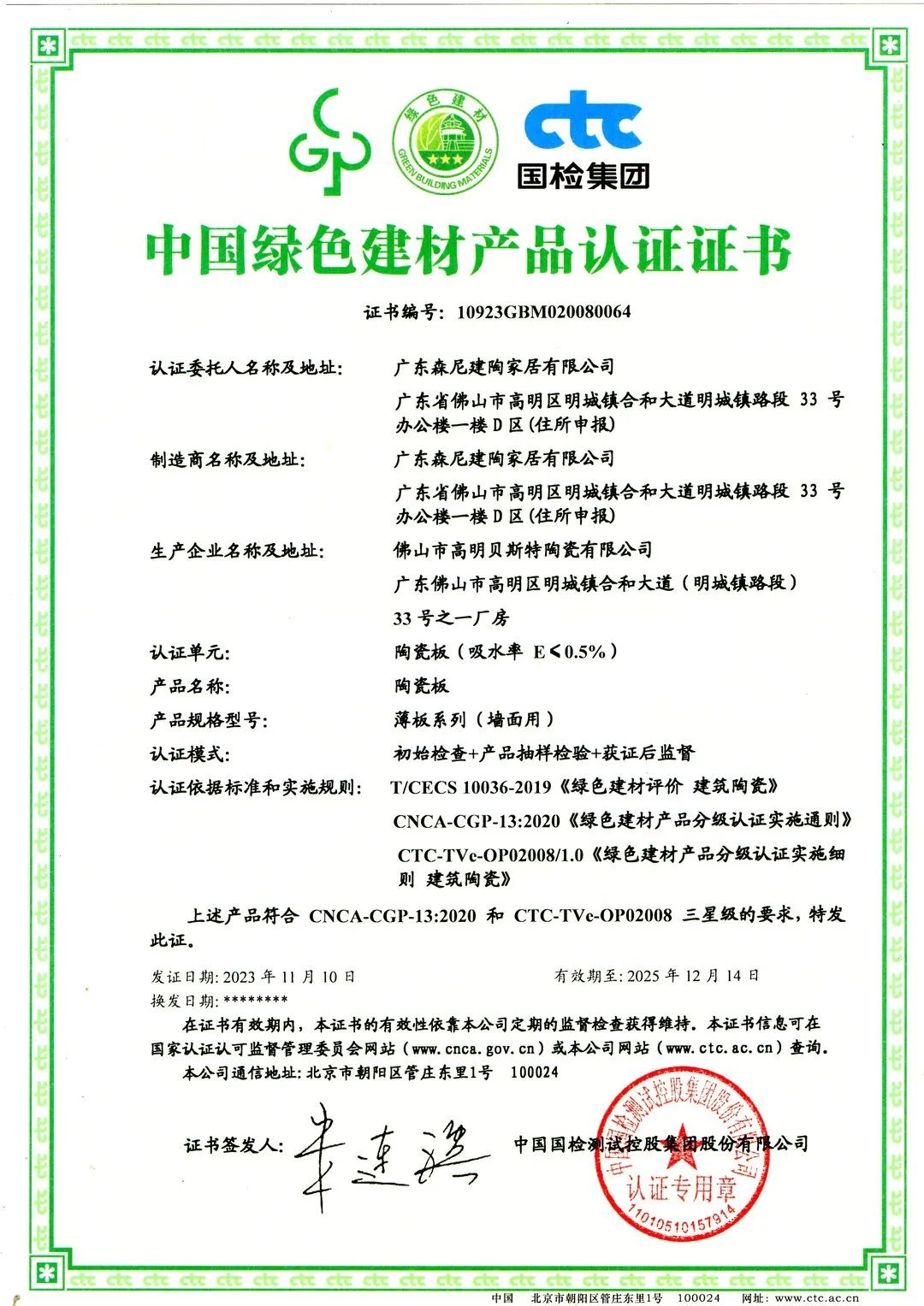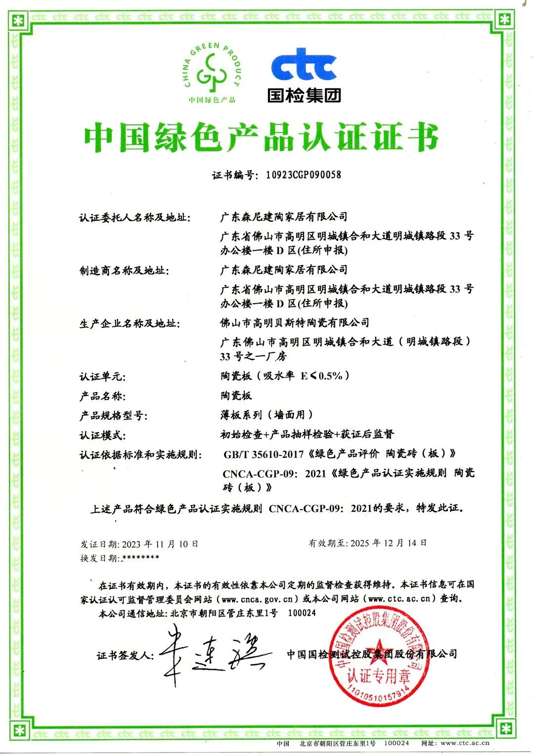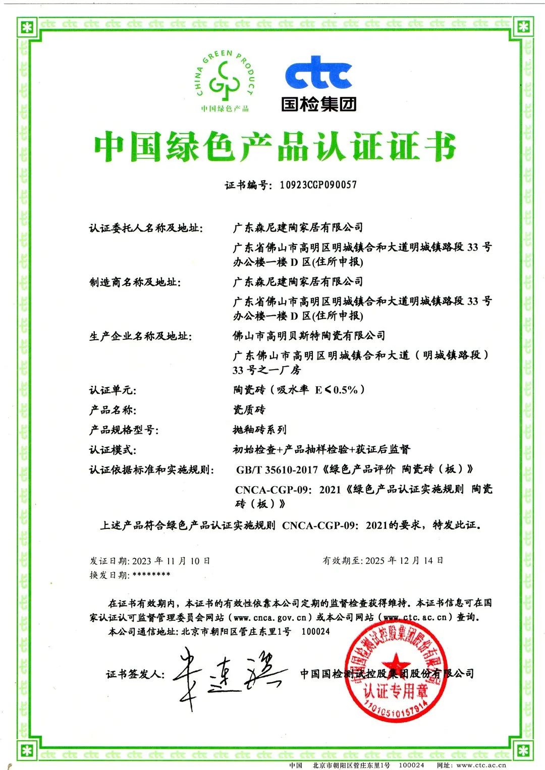 森尼陶瓷板产品符合绿色产品认证实施规则 CNCA-CGP-09:2021的要求;森尼瓷质砖产品符合CNCA-CGP-13:2020 和 CTC-TVe-OP02008 三星级的要求。