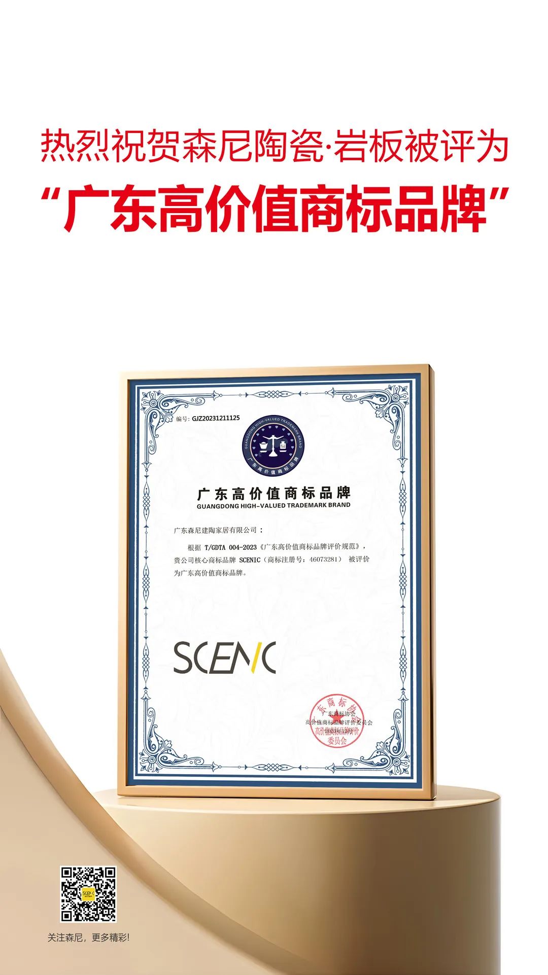 近日,“广东高价值商标品牌发展论坛暨成果发布会”在广州成功举办。在本次的广东省重点行业(陶瓷)高价值商标品牌榜单中,广东森尼建陶家居有限公司旗下森尼陶瓷·岩板作为佛山本土品牌,凭借其强大的综合实力跻身前列。
