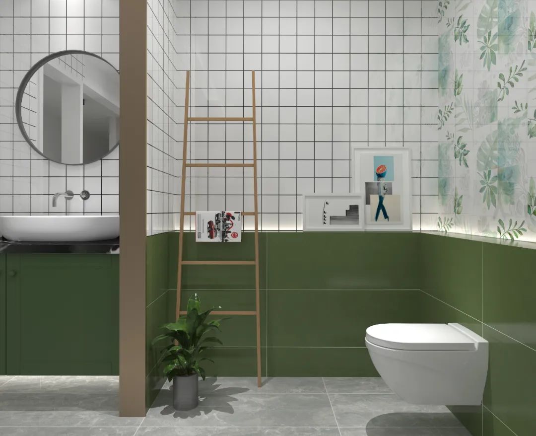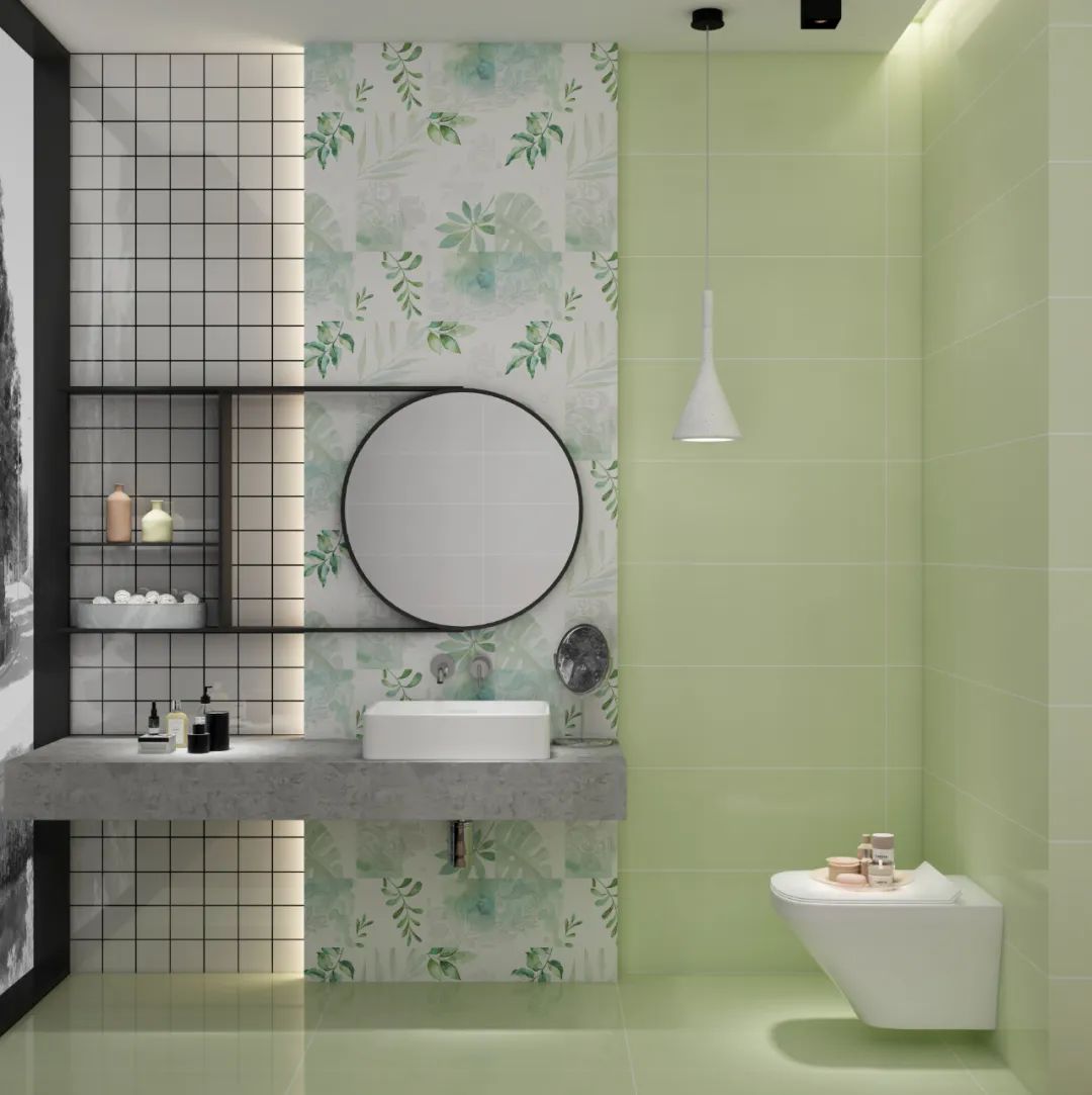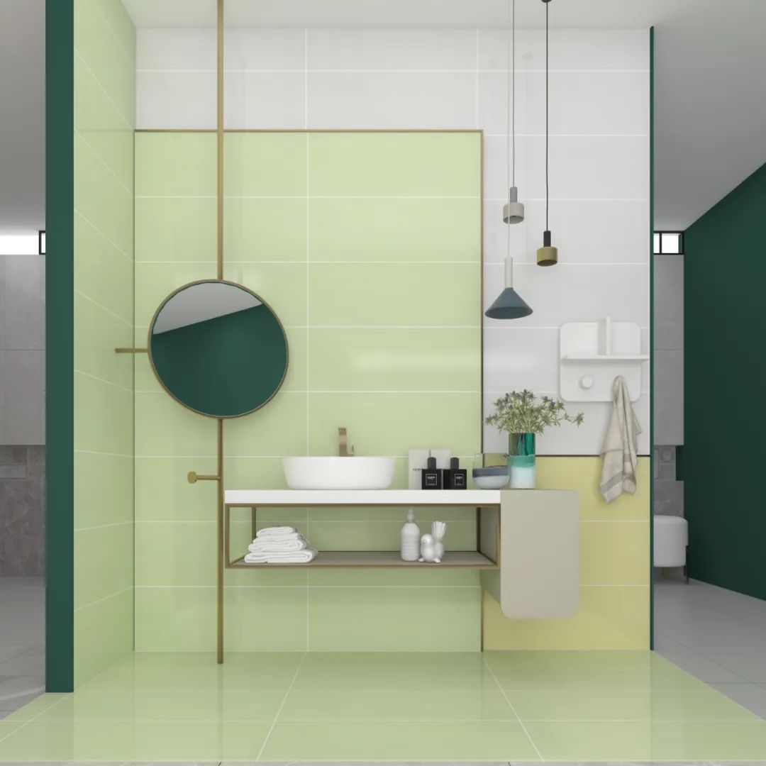 森尼IN·色系列轻奢绿,绿色中的高级色彩,在空间运用中赋予空间轻奢质感,同时它与百变小花砖搭配使用,营造出一种轻奢又低调的空间之感。