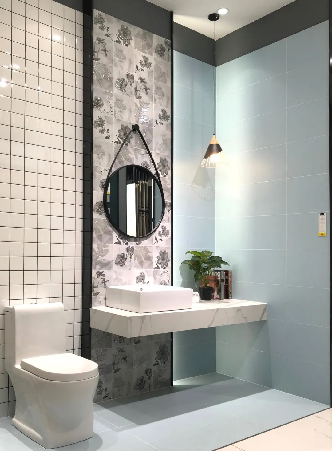 展厅实景展示墙面主砖采用高品质炻质砖产品,无论是颜色款式还是工艺品质等,都优于普通内墙砖,也属于森尼品牌技术创新的新一代产品。小花砖与色砖互不影响,各显光彩,简直就是最佳CP。