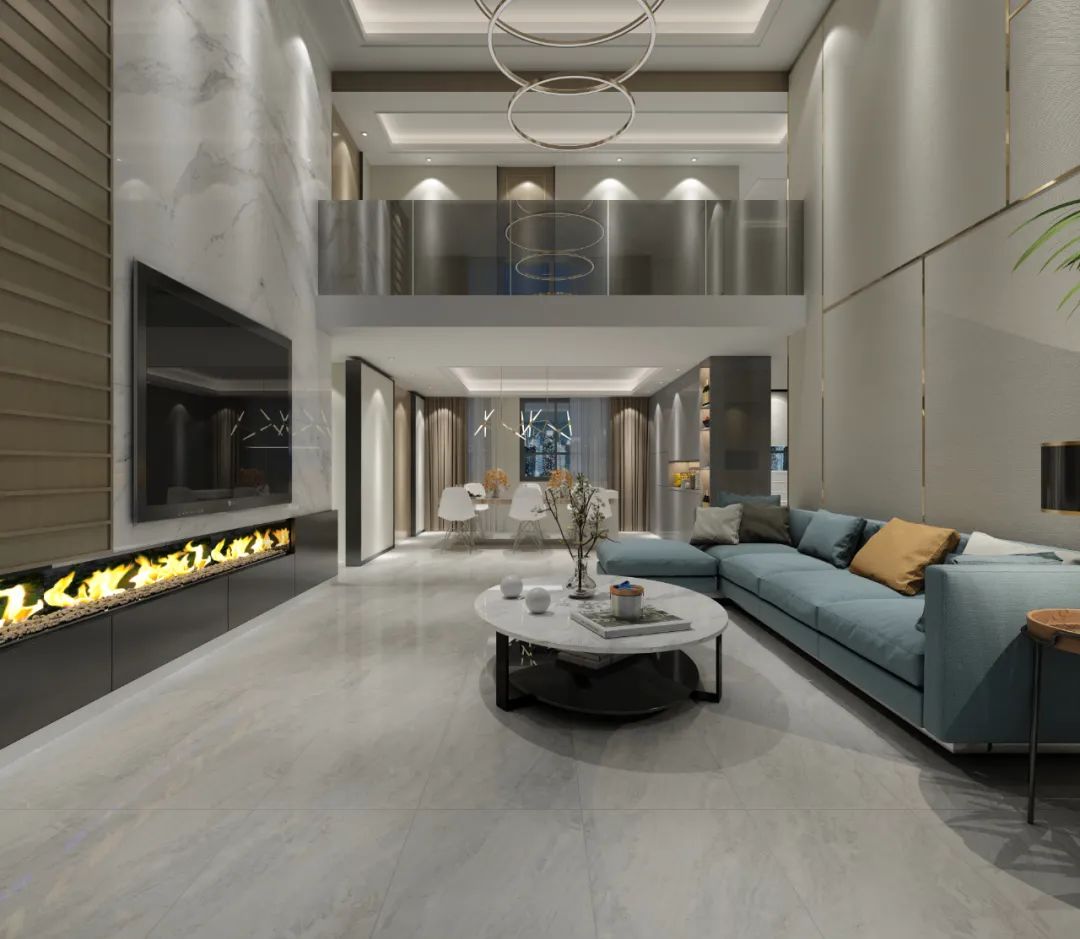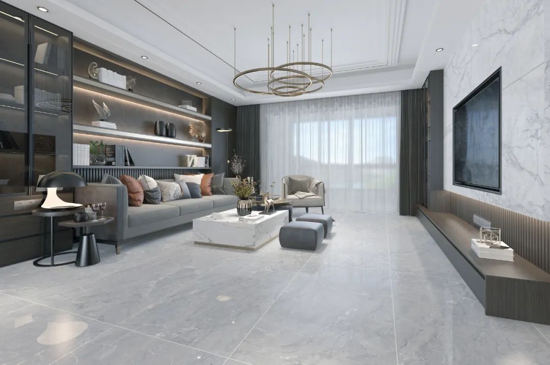 客厅在现代简约灰的基础色调下,搭配两个小巧的深灰色凳子,碰撞出无可比拟的优雅与高级。
