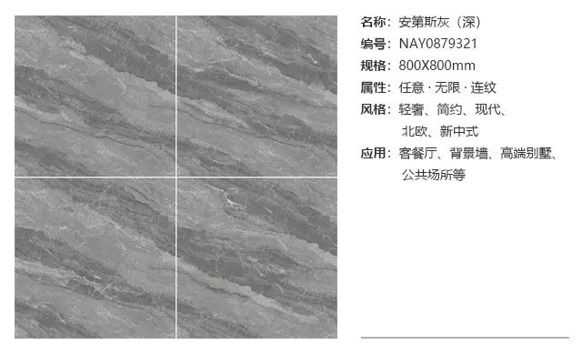 ▷ 安第斯灰(深)NAY0879321连纹展示效果安第斯灰(深)连纹砖将自然之景融入到产品,与自然流畅的纹理相互融合,质感与美观兼具,淡雅轻奢空间呼之欲出。