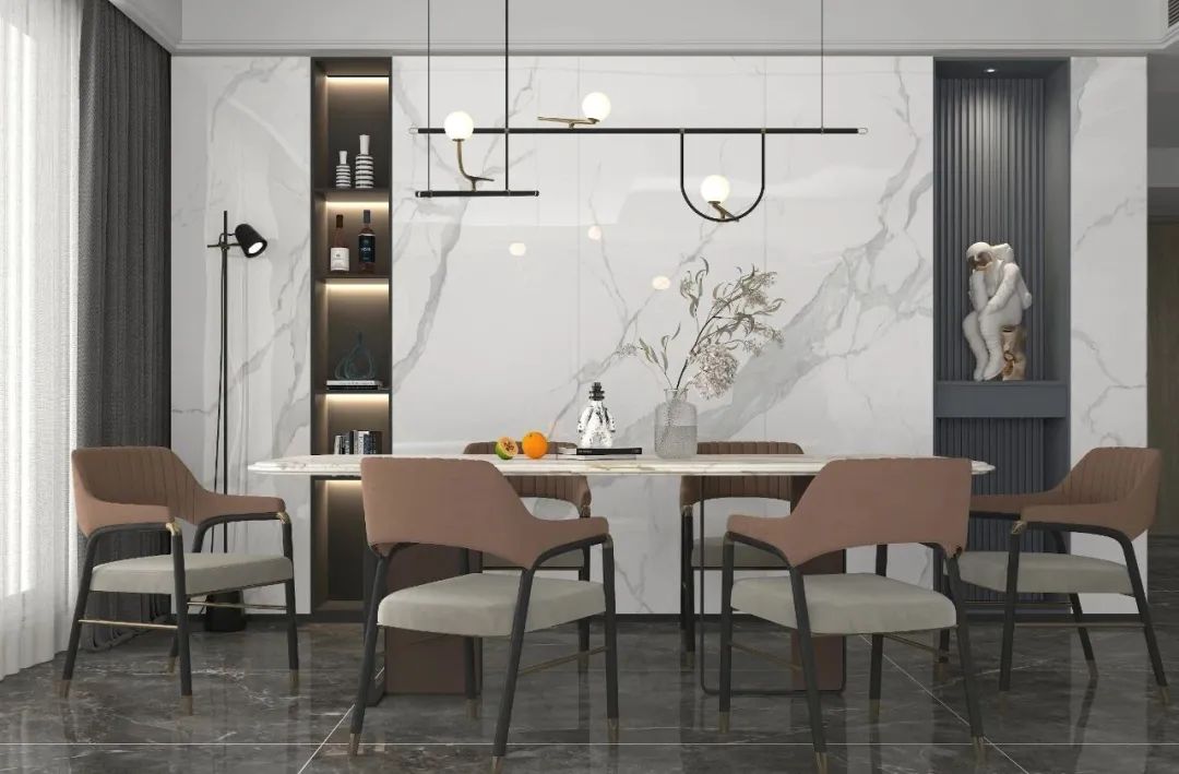 岩板应用较广泛,可以做到家居全案落地,背景墙、橱柜、饰面板、台面、餐桌、电视柜等一一满足,打破材料限定,实现全屋定制化。